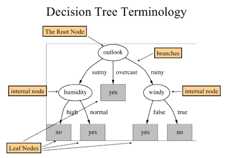 - root node(decision node): 모든 하위 카테고리들을 처음 여러개로 쪼갠 변수라고 할 수 있습니다.